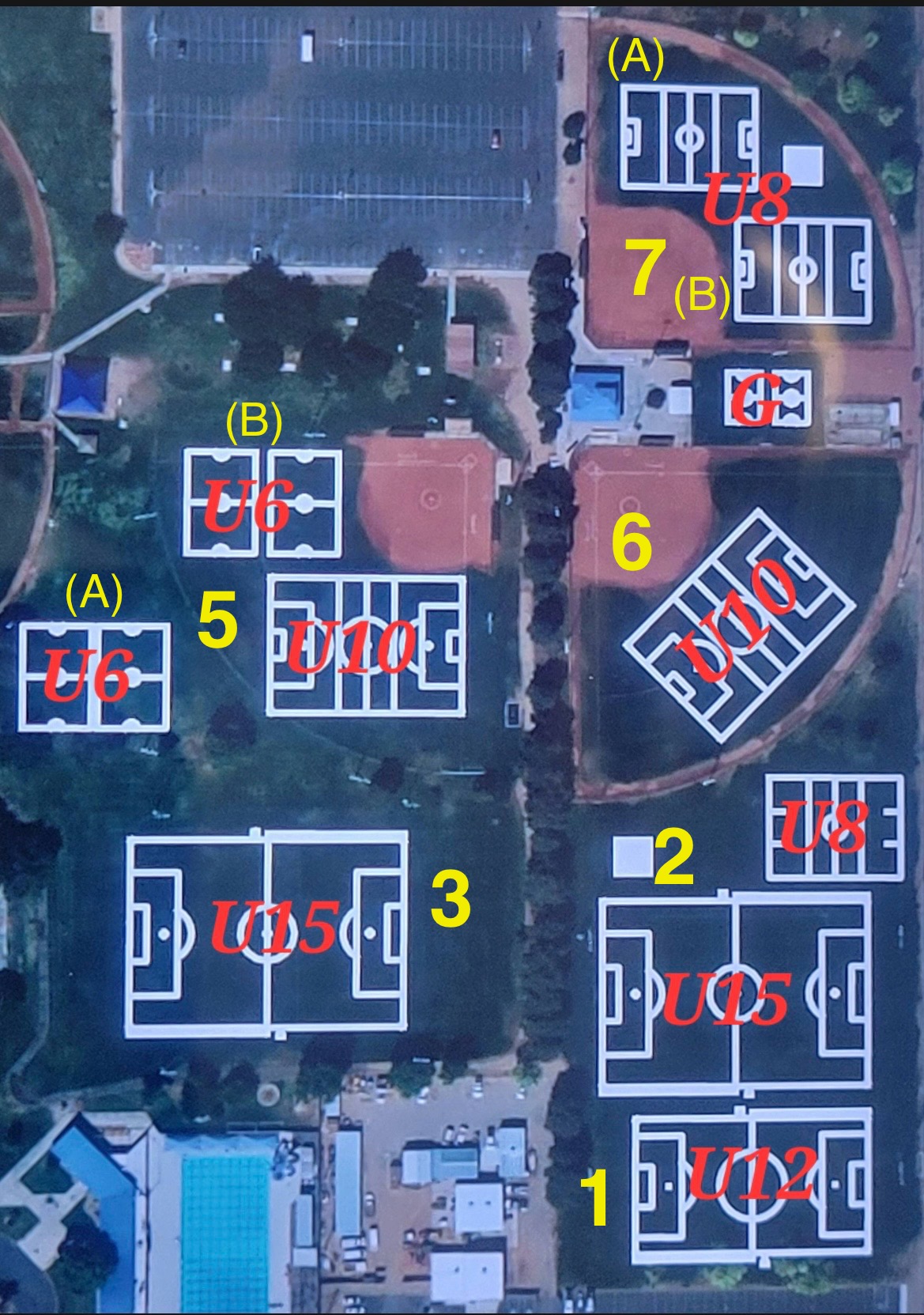 This year we have simplified the locations. Each side of the field is marked with a H or A at the half field line to specify team locations. There is a white line running parallel to the actual field sideline. Spectators are asked to site behind the second line. This keeps spectators from behind the Assistant Refs.